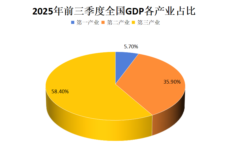 全国2025年前三季度GDP为1015036亿元,按不变价格计算,同比增长5.2%。其中,第一产业增加值58061亿元,同比增长3.8%,对经济增长的贡献率为4.7%;第二产业增加值364020亿元,同比增长4.9%,对经济增长的贡献率为34.6%;第三产业增加值592955亿元,同比增长5.4%,对经济增长的贡献率为60.7%。三次产业增加值占GDP的比重分别为5.7%、35.9%和58.4%。