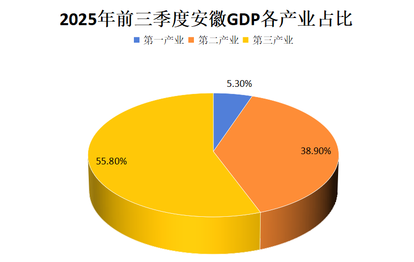 根据地区生产总值统一核算结果,安徽省2025年前三季度地区生产总值(GDP)39770亿元,按不变价格计算,同比增长5.4%。分产业看,第一产业增加值2093亿元,增长3.4%;第二产业增加值15481亿元,增长6.2%;第三产业增加值22196亿元,增长5.0%。