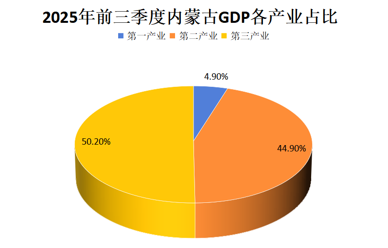 根据地区生产总值统一核算结果,内蒙古2025年前三季度地区生产总值(GDP)18471.9亿元,按不变价格计算,同比增长4.5%。分产业看,第一产业增加值902.9亿元,同比增长5.3%;第二产业增加值8290.2亿元,增长4.4%;第三产业增加值9278.9亿元,增长4.5%。