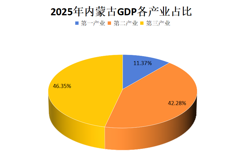 根据地区生产总值统一核算结果,内蒙古2025年全区地区生产总值26710亿元,按不变价格计算,比上年增长4.7%。其中,第一产业增加值3037亿元,增长5.0%;第二产业增加值11293亿元,增长5.5%;第三产业增加值12381亿元,增长4.0%。