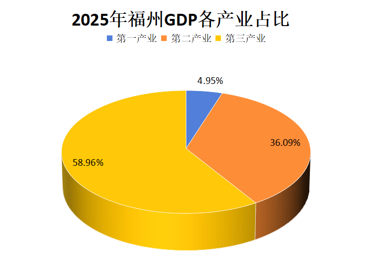 根据地区生产总值统一核算结果,福州市2025年实现地区生产总值(GDP)15112.32亿元,按不变价格计算,同比增长5.6%。其中,第一产业增加值748.72亿元,增长4.1%;第二产业增加值5453.63亿元,增长5.6%;第三产业增加值8909.96亿元,增长5.6%。