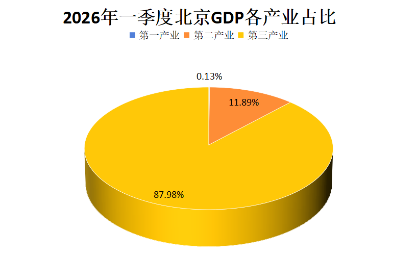 根据地区生产总值统一核算结果,北京市2026年一季度实现地区生产总值12931.5亿元,按不变价格计算,同比增长5.9%。分产业看,第一产业实现增加值16.5亿元,增长2.4%;第二产业实现增加值1537.8亿元,增长2.6%;第三产业实现增加值11377.2亿元,增长6.4%。