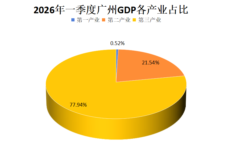 根据广东省地区生产总值统一核算结果,广州市2026年一季度地区生产总值7988.88亿元,按不变价格计算,同比增长6.0%。其中,第一产业增加值41.39亿元,增长4.2%;第二产业增加值1720.62亿元,增长5.8%;第三产业增加值6226.87亿元,增长6.1%。