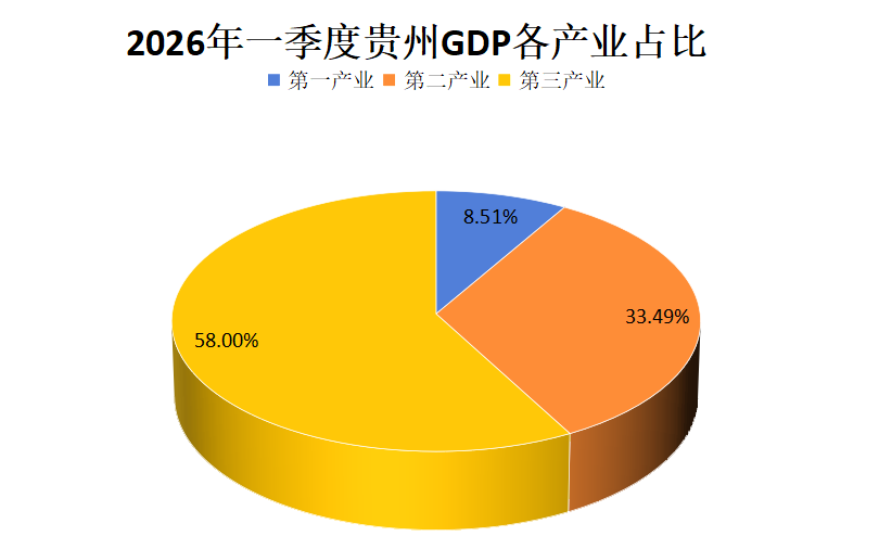 根据地区生产总值统一核算结果,贵州省2026年一季度地区生产总值5867.43亿元,按不变价格计算,同比增长4.7%。其中,第一产业增加值499.33亿元,同比增长5.1%;第二产业增加值1964.95亿元,增长5.4%;第三产业增加值3403.15亿元,增长4.2%。