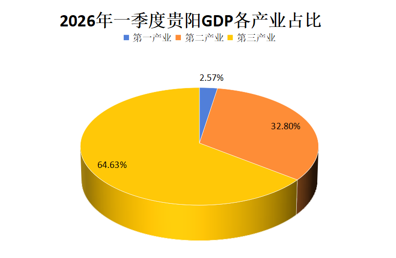 根据市(州)生产总值统一核算结果,贵阳市2026年一季度生产总值1416.43亿元,按不变价格计算,同比增长5.0%。其中,第一产业增加值36.44亿元,增长6.4%;第二产业增加值464.60亿元,增长5.6%;第三产业增加值915.39亿元,增长4.6%。