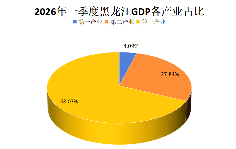 根据地区生产总值统一核算结果,黑龙江省2026年一季度地区生产总值为3480.3亿元,按不变价格计算,同比增长3.7%。其中,第一产业增加值为142.3亿元,同比增长2.5%;第二产业增加值为969.1亿元,增长2.5%;第三产业增加值为2368.9亿元,增长4.2%。
