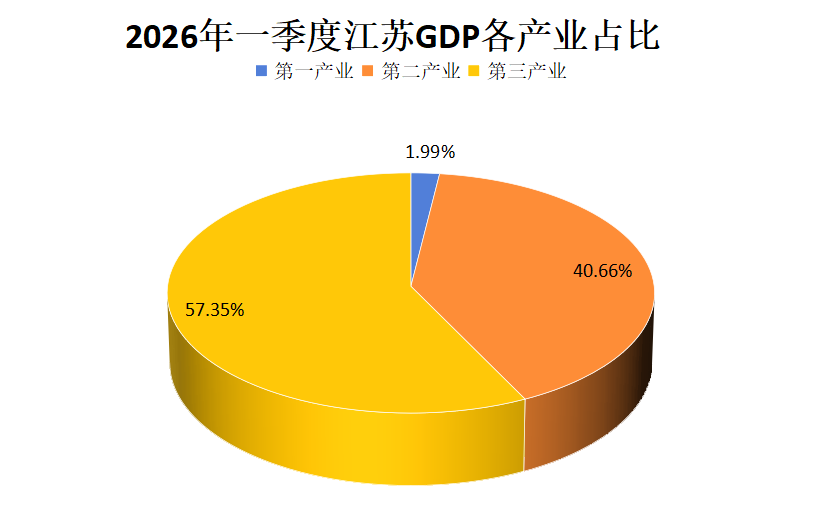 根据地区生产总值统一核算结果,江苏省2026年一季度实现地区生产总值34483亿元,按不变价格计算,同比增长5.4%。其中,第一产业增加值684.8亿元,同比增长2.8%;第二产业增加值14021亿元,增长5.7%;第三产业增加值19777.2亿元,增长5.2%。