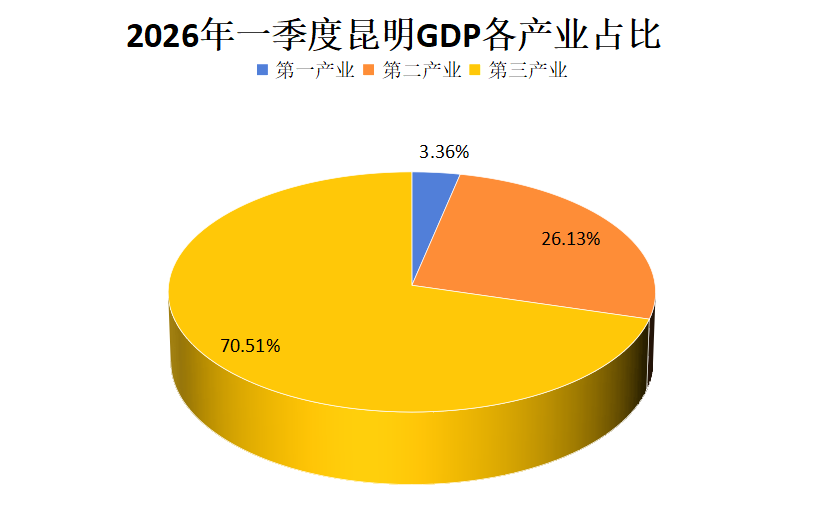 根据地区生产总值统一核算结果,昆明市2026年一季度实现地区生产总值2235.36亿元,按不变价格计算,同比增长3.2%。分产业看,第一产业实现增加值75.16亿元,增长3.0%;第二产业实现增加值584.19亿元,下降0.5%;第三产业实现增加值1576.01亿元,增长4.6%。
