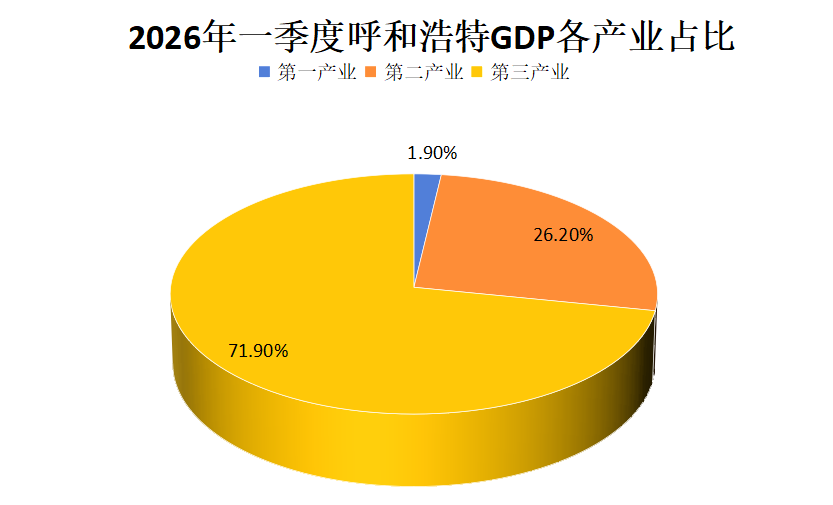根据盟市生产总值统一核算结果,呼和浩特市2026年一季度地区生产总值1029.6亿元,同比增长5.0%。分三次产业看,第一产业增加值19.1亿元,同比增长5.5%;第二产业增加值269.8亿元,同比增长5.3%;第三产业增加值740.7亿元,同比增长4.8%,三次产业结构比调整为1.9:26.2:71.9,对经济增长的贡献率分别为2.1%、28.2%、69.7%。